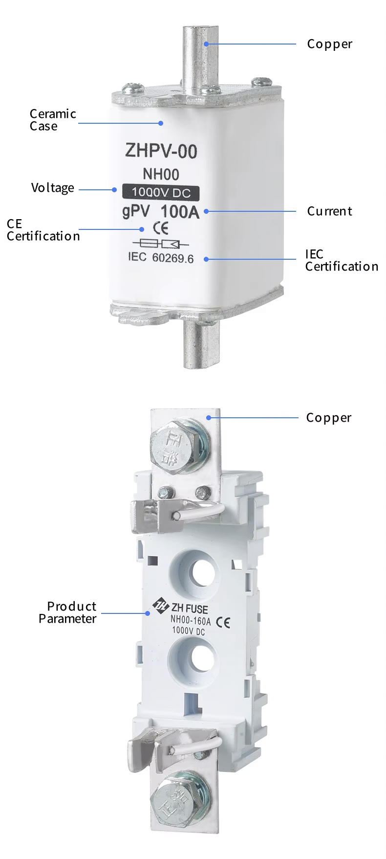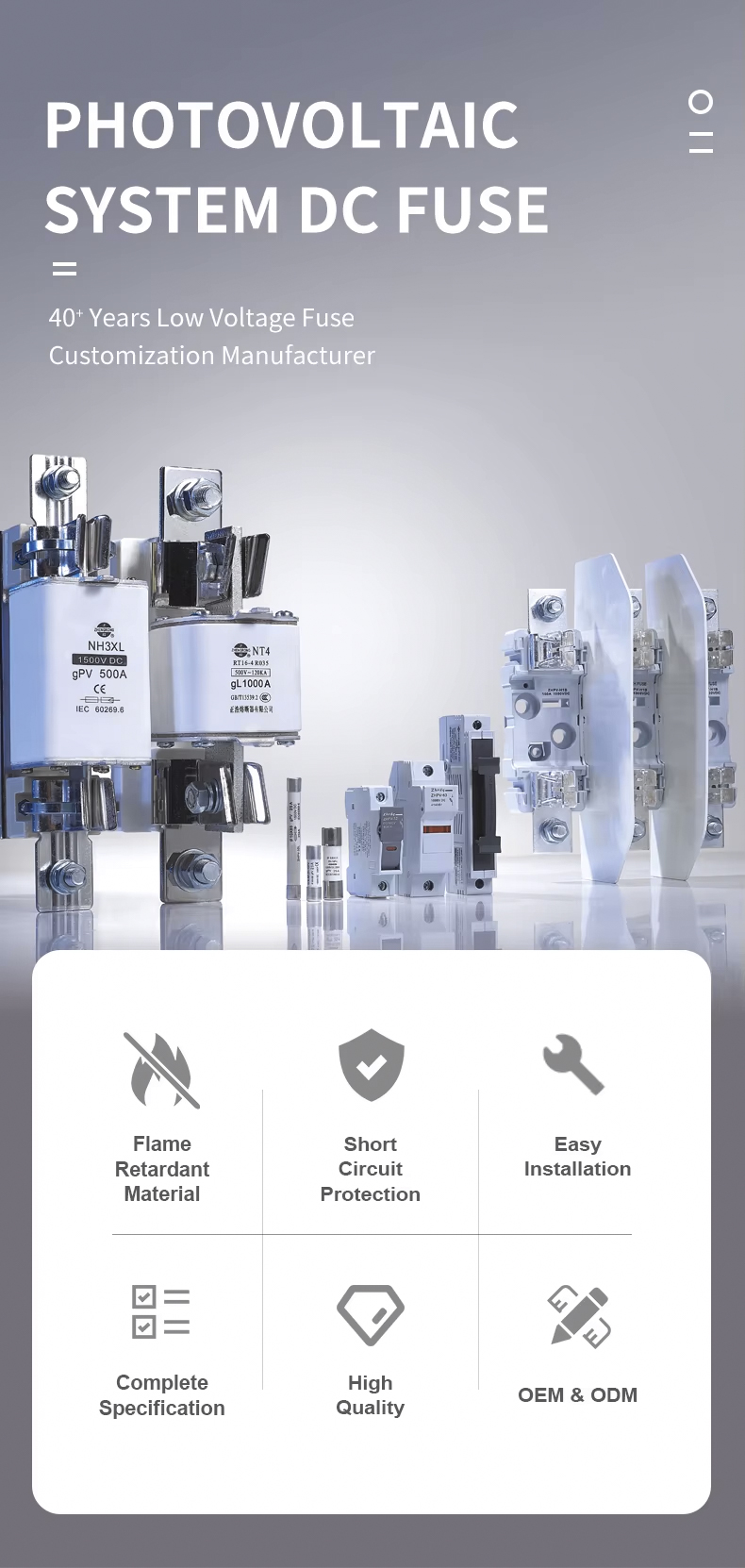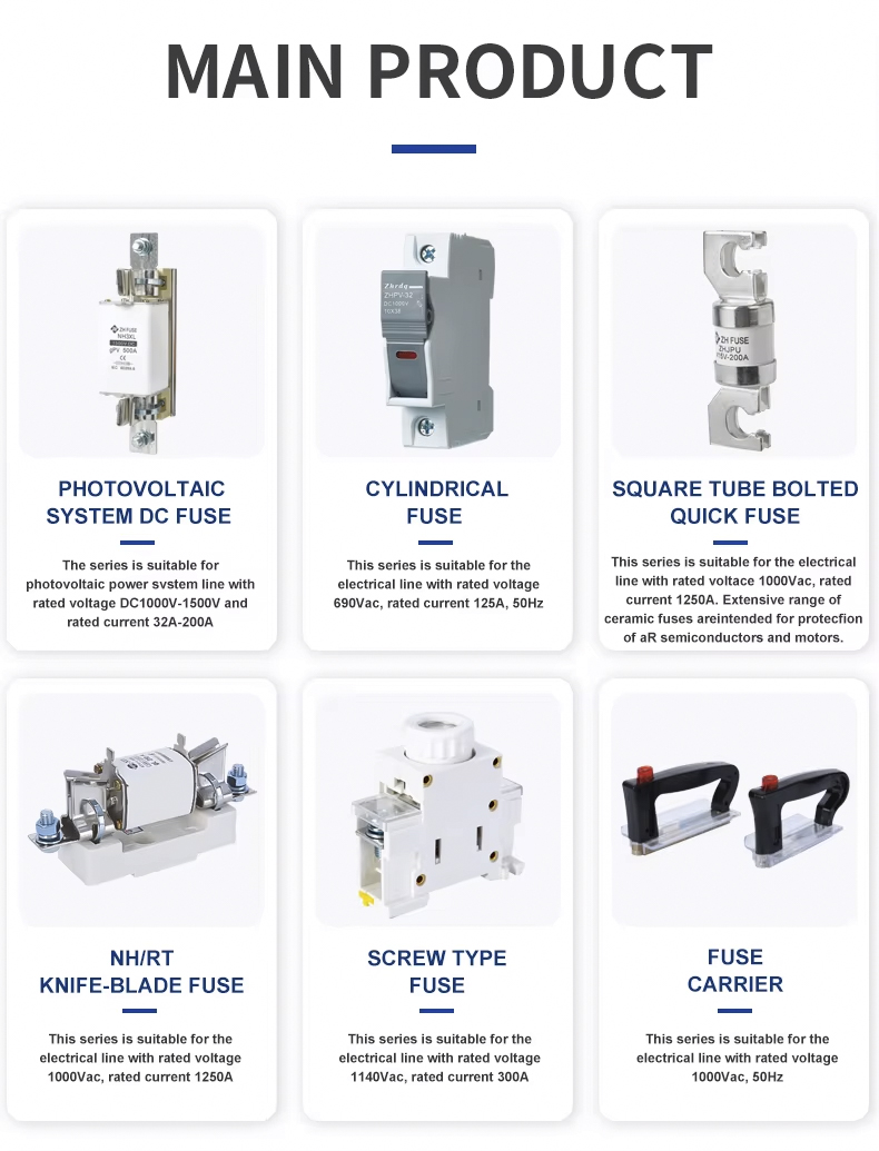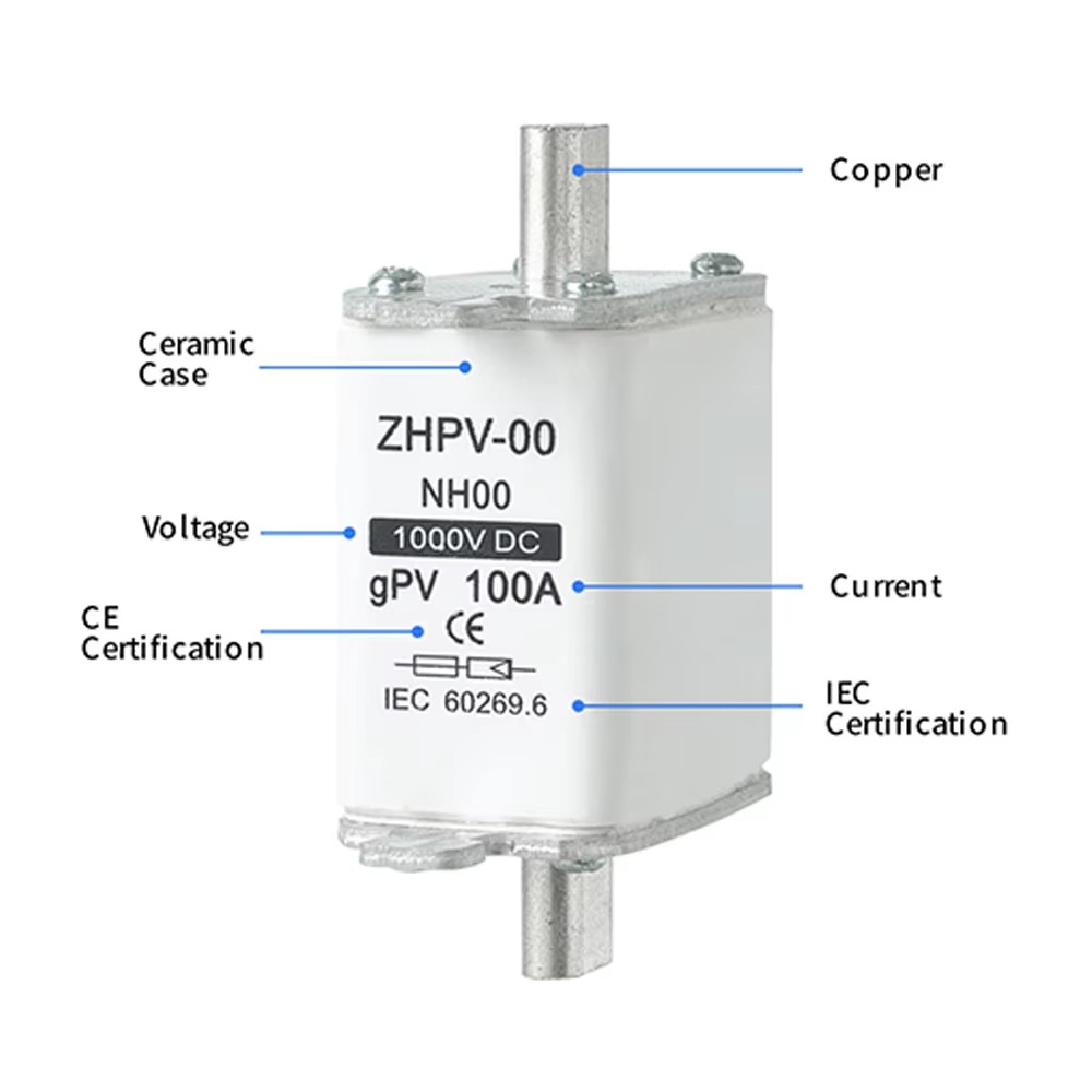Фотоэлектрическая система NH00. Плавкая вставка постоянного тока, 1000 В, 32–100 А. Высококачественные материалы выбраны для обеспечения стабильных и надежных характеристик предохранителя, быстрой скорости срабатывания и высокой безопасности. Компактный внешний вид, простой в установке, широко используется в различных системах, таких как фотоэлектрические объединительные коробки, инверторы и распределительные шкафы постоянного тока. Плавкая вставка фотоэлектрической системы NH00 постоянного тока 1000 В, 32~100 А прошла множество международных сертификаций и соответствует стандартам IEC, что делает ее идеальным выбором для обеспечения безопасной эксплуатации систем электростанций.