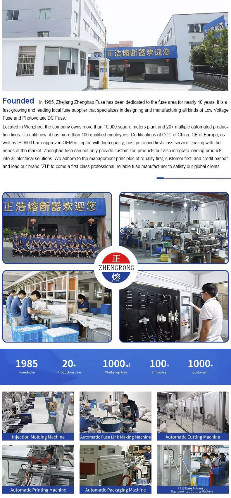 Плавкая вставка для фотоэлектрической системы постоянного тока 1000 В, 32–100 А подходит для защиты от перегрузки по току в фотоэлектрических системах постоянного тока. Этот продукт поддерживает максимальное напряжение 1000 В постоянного тока и диапазон тока 32 ~ 100 А. Он разработан специально для солнечных электростанций и систем хранения энергии и может эффективно предотвратить повреждение оборудования, вызванное перегрузкой или коротким замыканием.